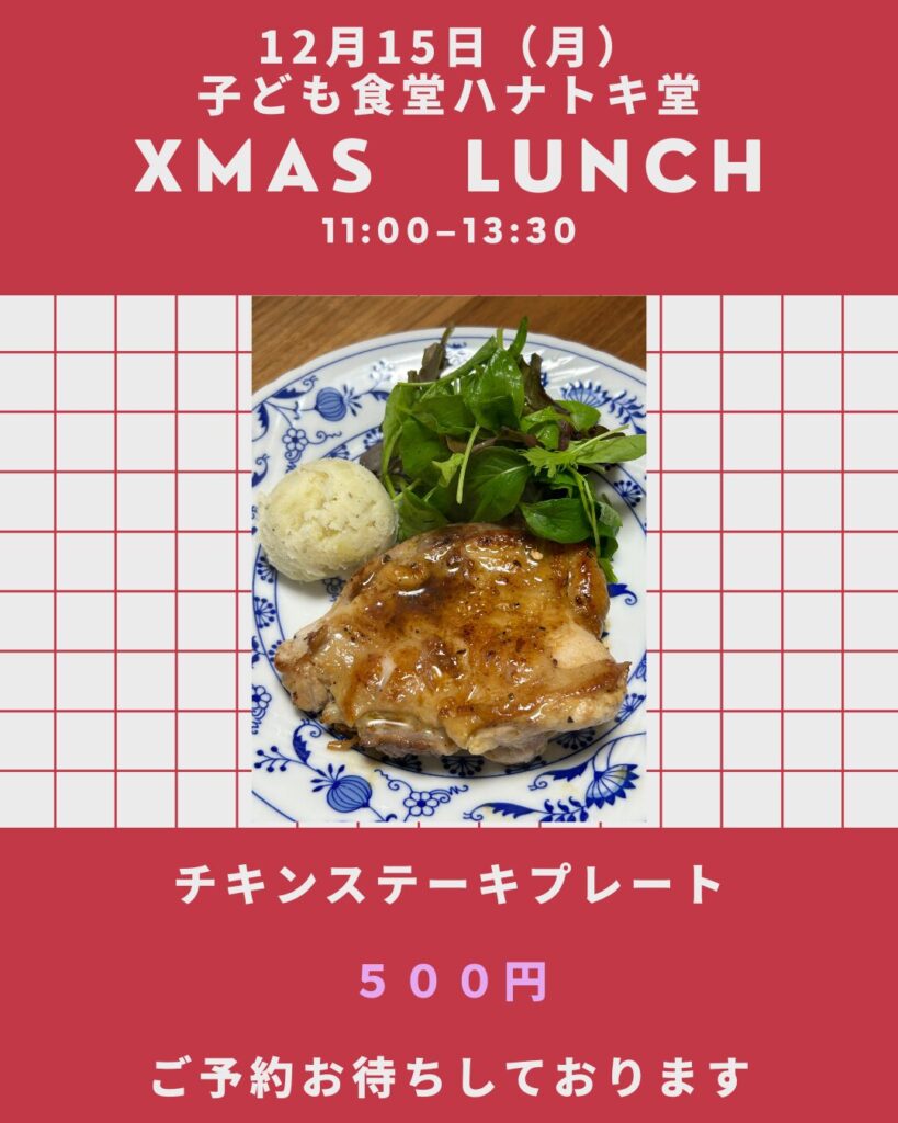 お知らせ 12月の子ども食堂ハナトキ堂のご案内 2025.12.08 寒くなってしましたー。 2025年最後の子ども食堂ハナトキ堂は Xmasチキンステーキです。 このところアナウンスする前に予約が埋まってしまっていたので、久しぶりの告知な気がします。 お持ち帰りも可能です。 ご予約お待ちしておりまーす。
